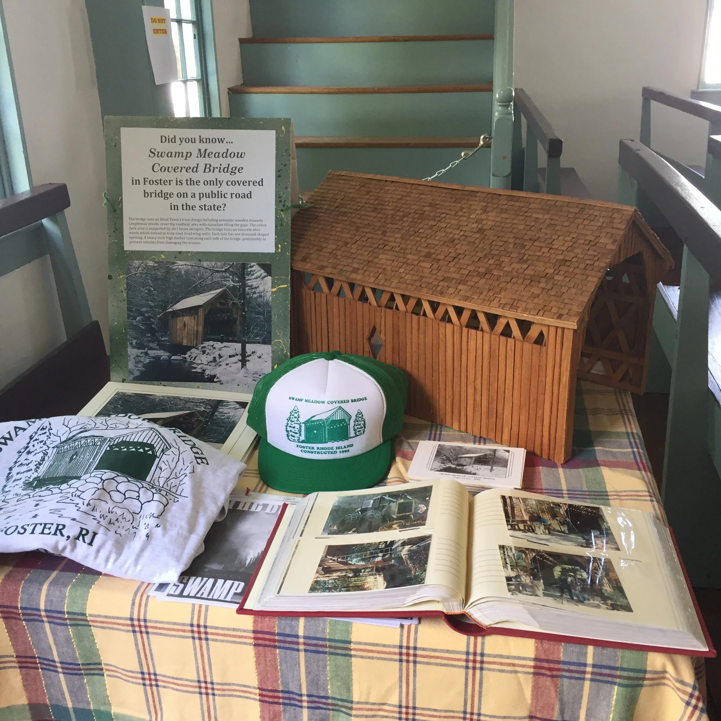 Designed by our very own long time volunteer and trustee Jed Dixon, the Swamp Meadow Covered Bridge is the only covered bridge on a public road in Rhode Island. It is located on Central Pike, just west of the intersection with Foster Center Road (Rte 94) in Foster. Foster Preservation Society has Swamp Meadow Covered Bridge t-shirts for sale on their website.
